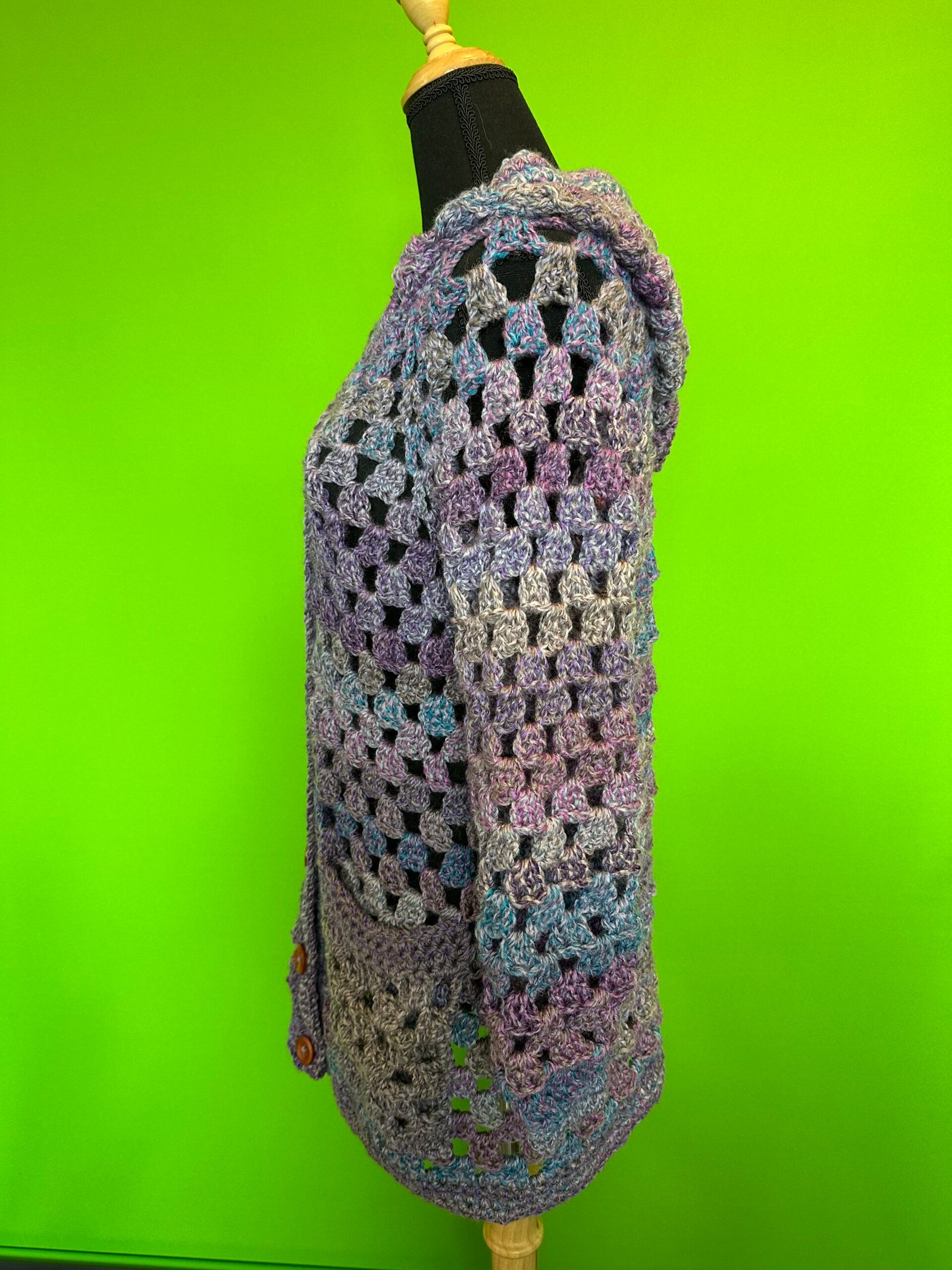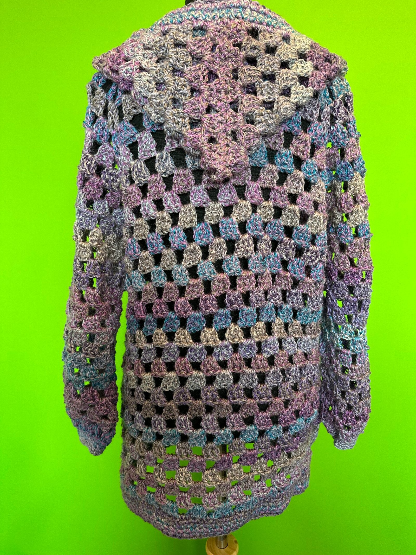 Crocheted Granny Cardigan can be waist-length or long version. I made this one as the long version. It’s made with chunky Acrylic yarn. Care: Washer and Dryer safe.