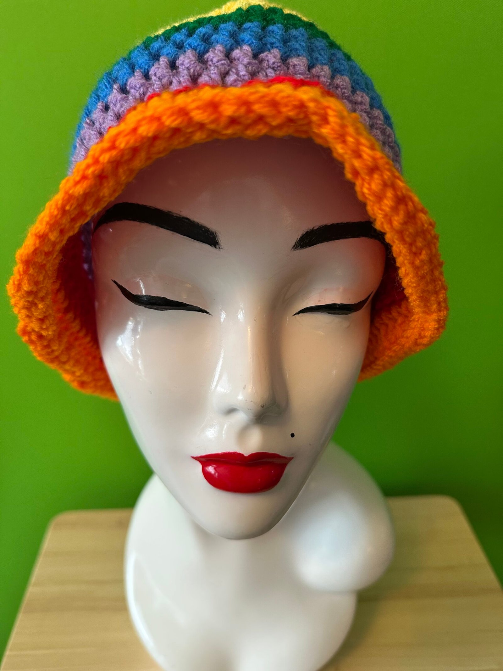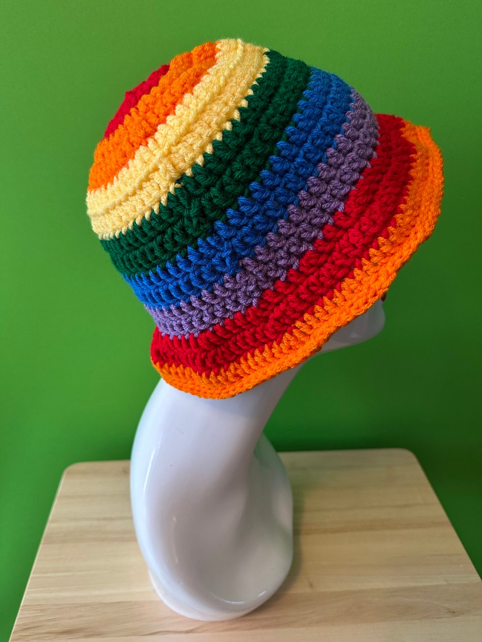 Crocheted Granny Square Bucket Hat in the color of Dark Rainbow, and made with Acrylic Yarn