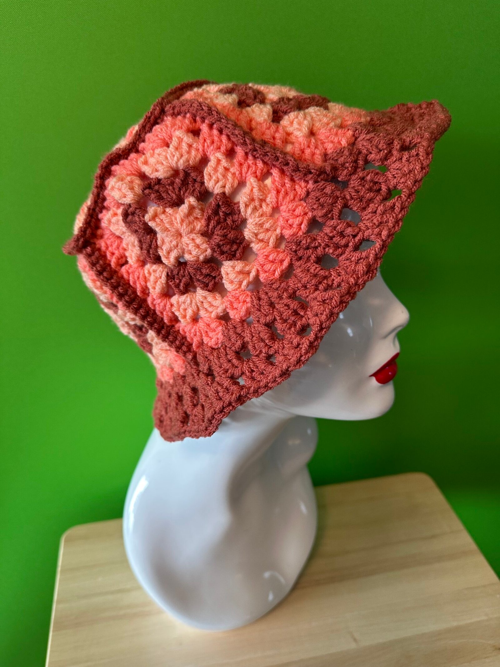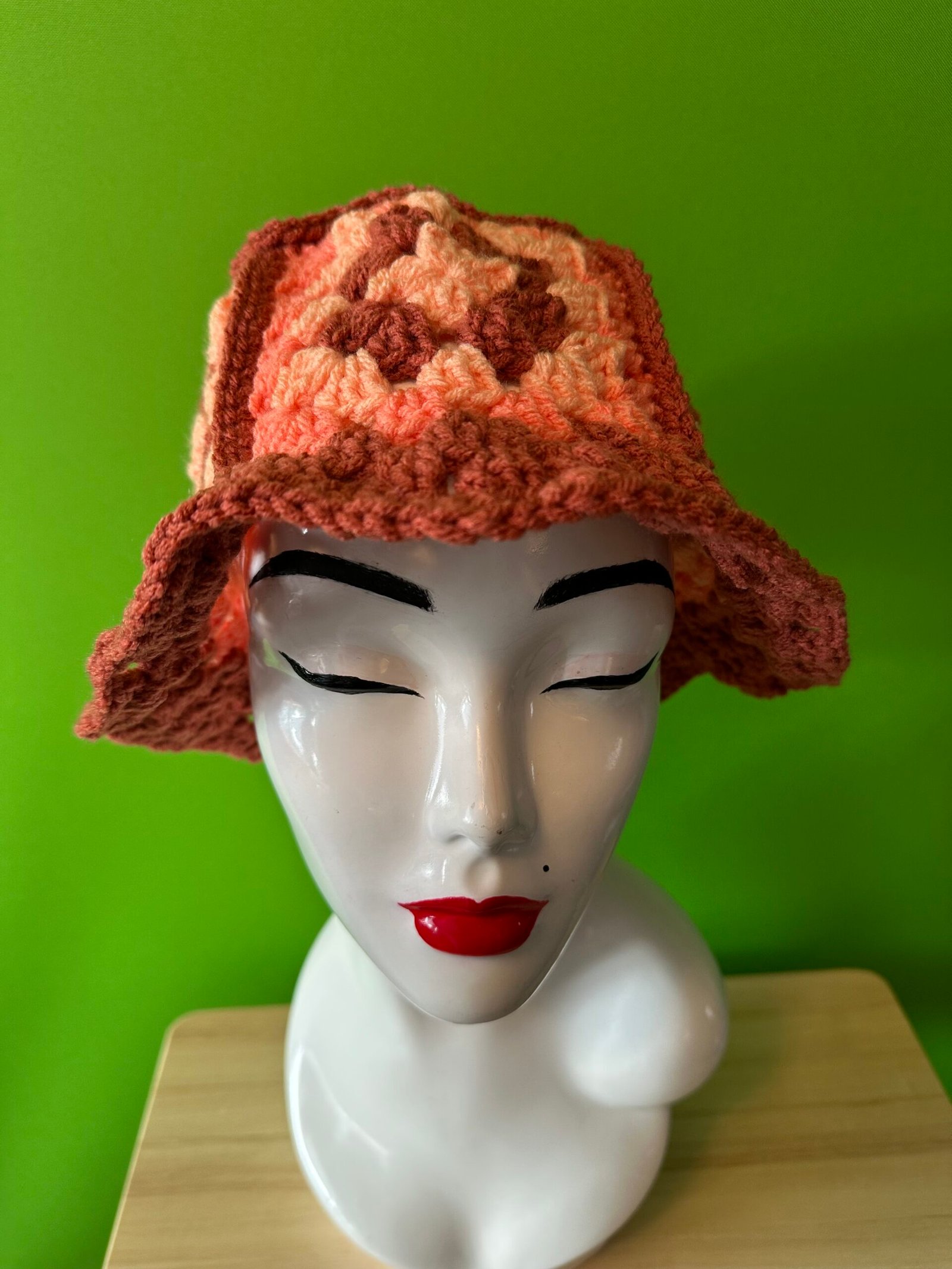 Crocheted Granny Square Bucket Hat in the colors Carrot/Orange. Made with Acrylic yarn which is machine wash and dry-able.