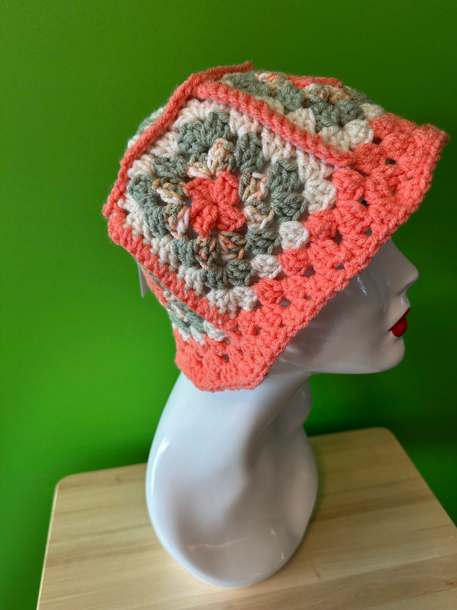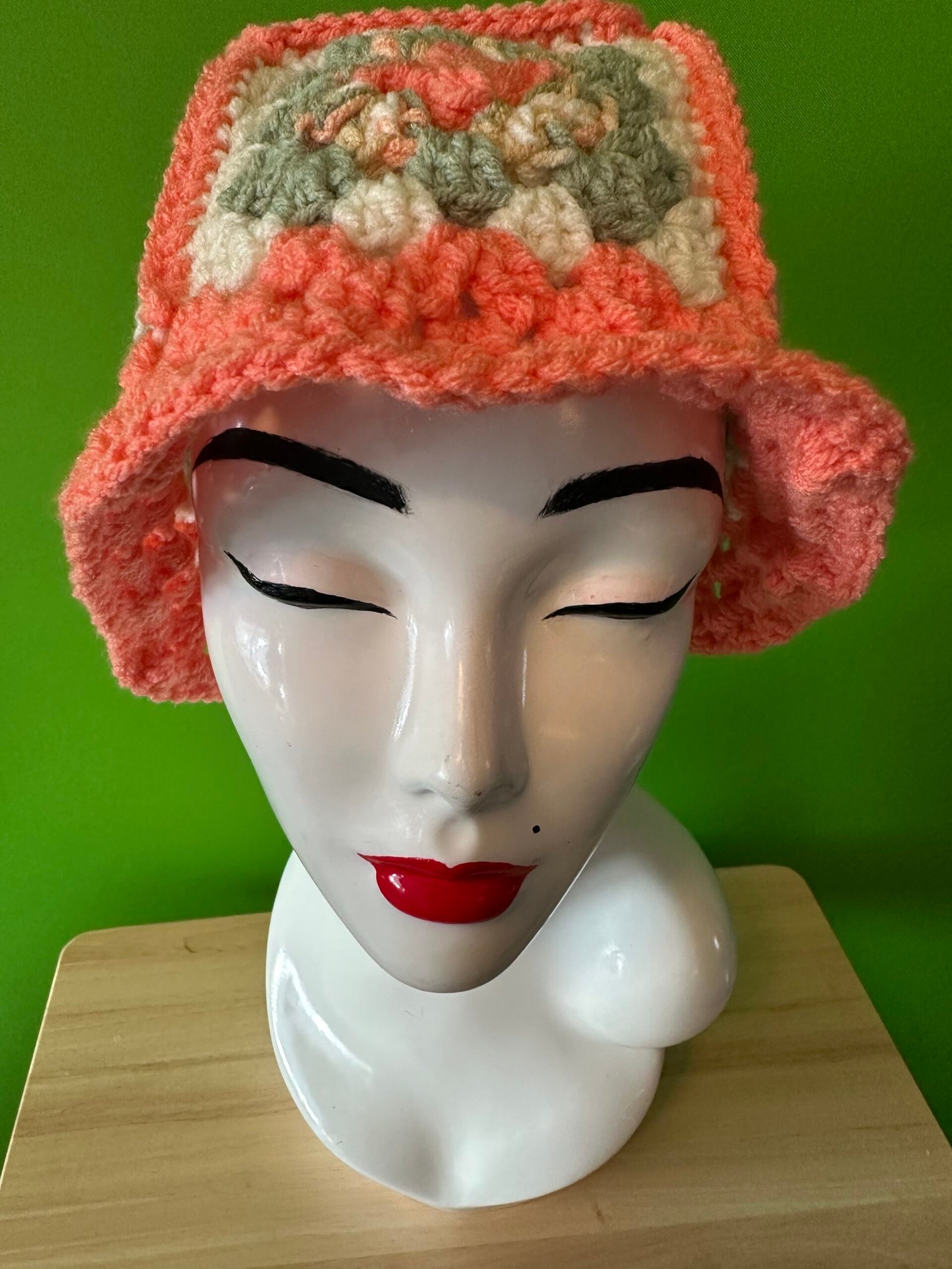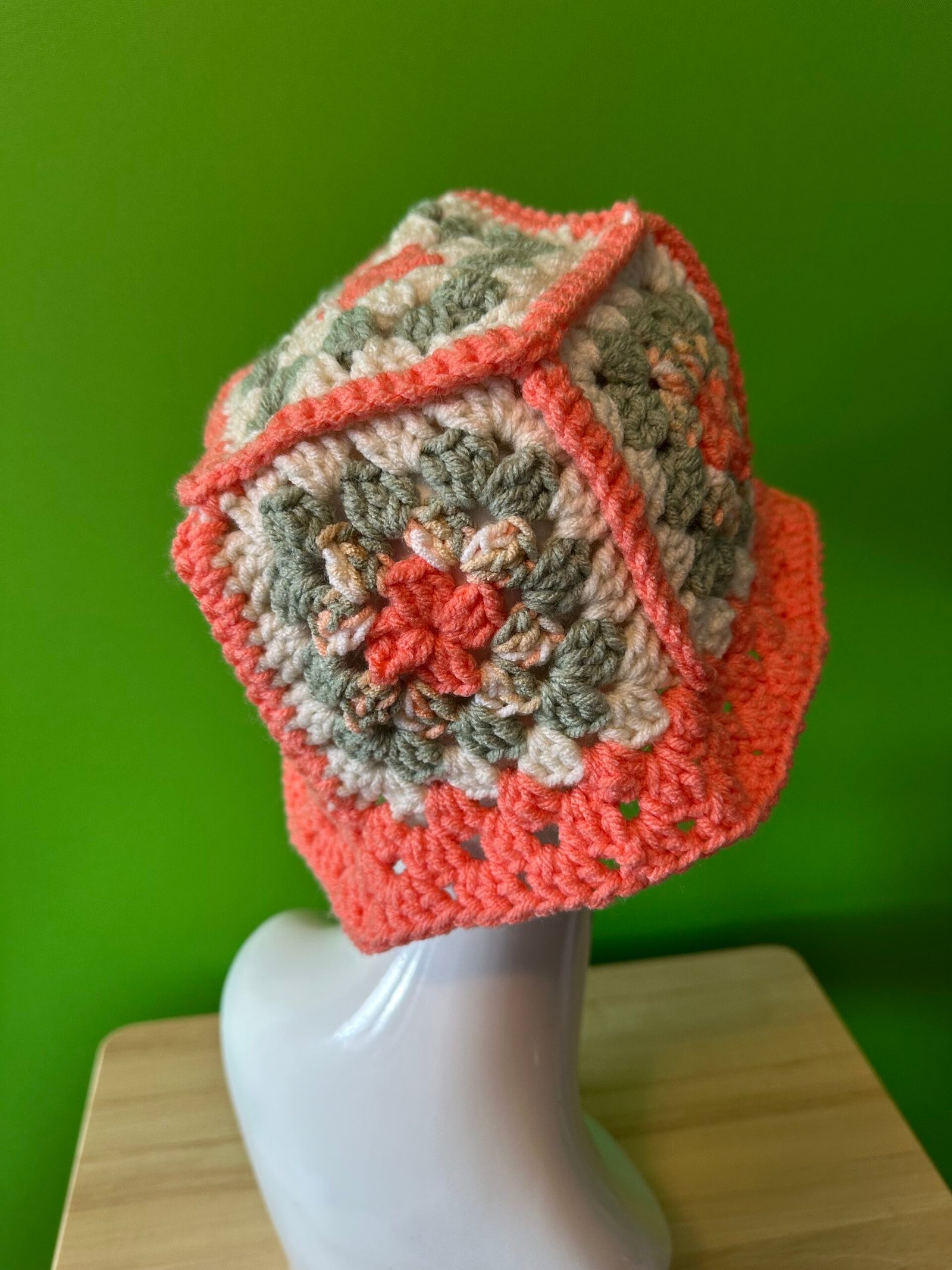 Crocheted Granny Square Bucket Hat in the colors of Coral/Sage, made with Acrylic Yarn
