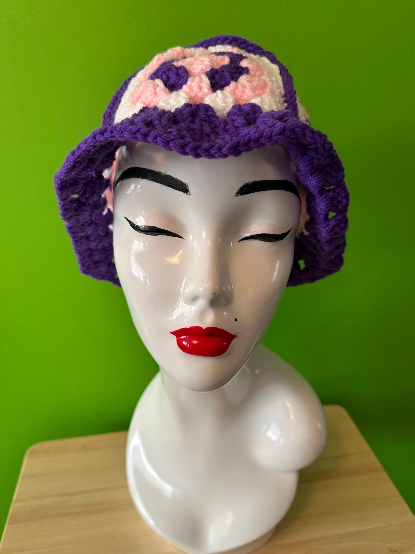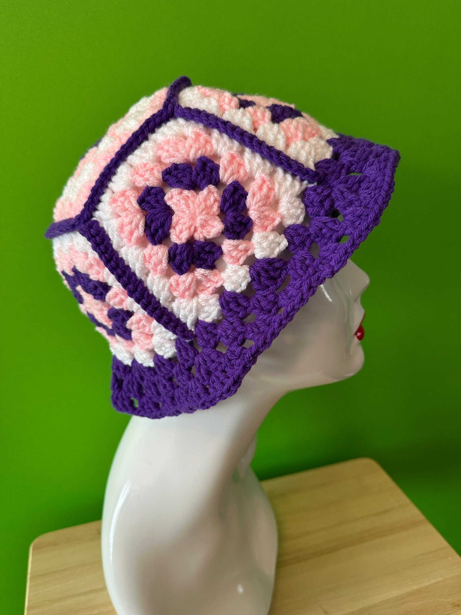 /    /  Accessories, Bucket Hat, Head Wear  /  Crocheted Granny Square Bucket Hat – Purple/Pink