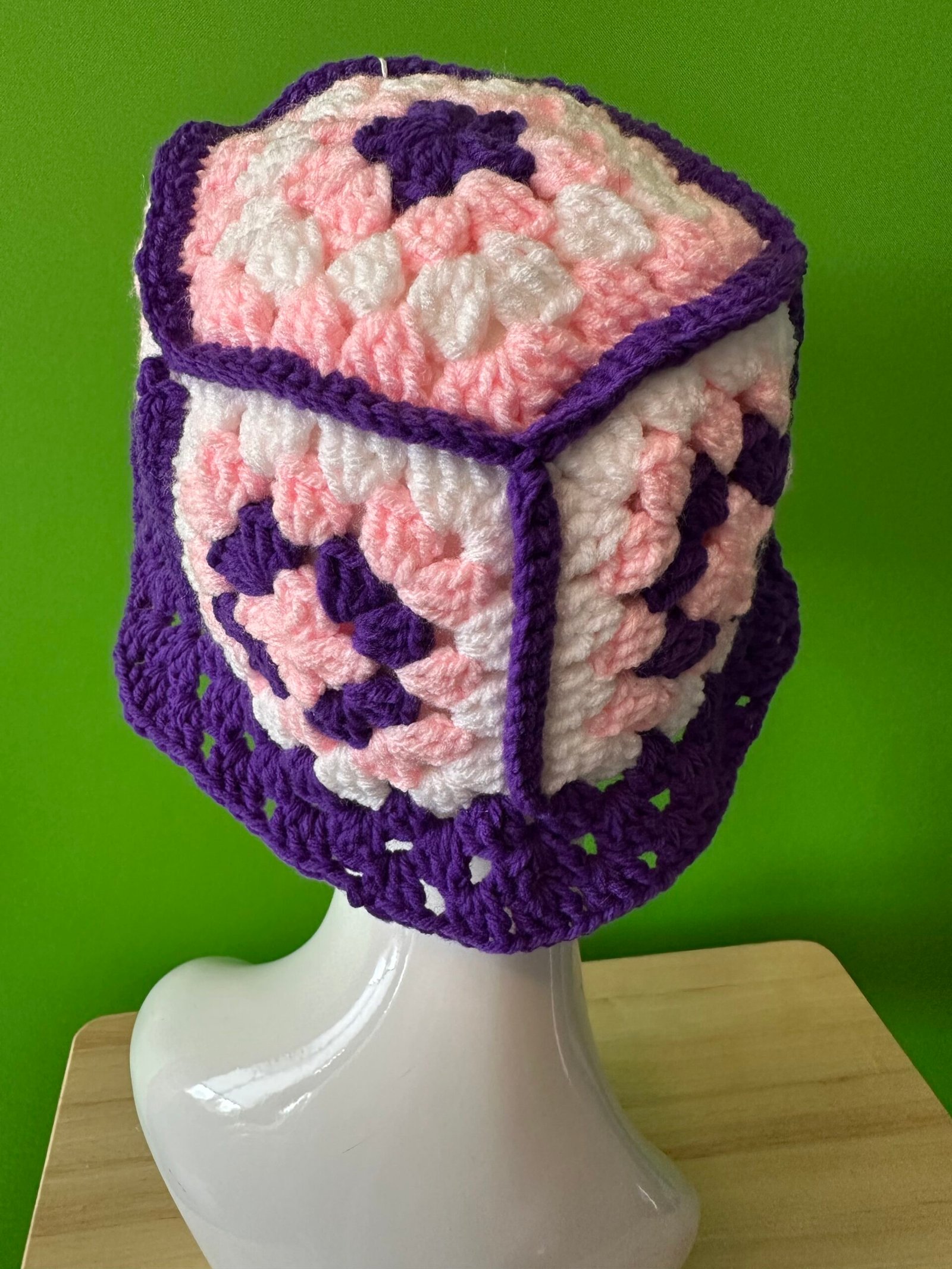 Crocheted Granny Square Bucket Hat – Purple/Pink