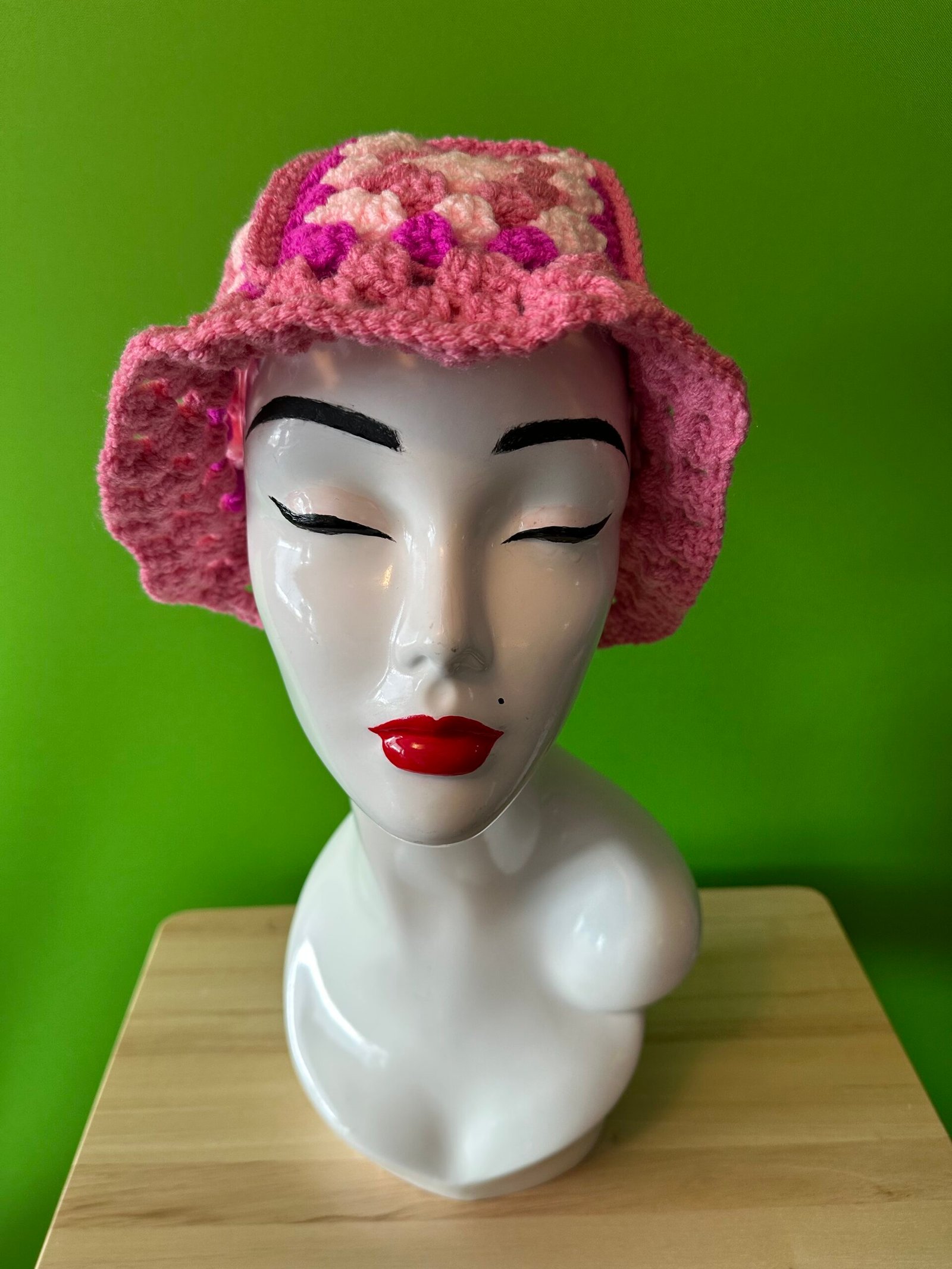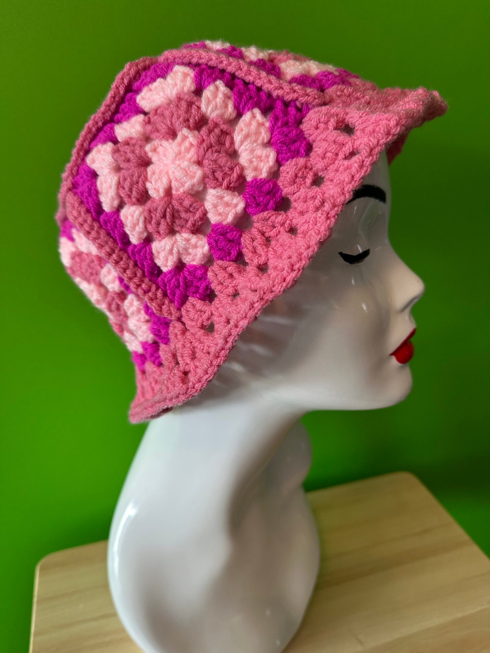 Crocheted Granny Square Bucket Hat – Rose/Pink