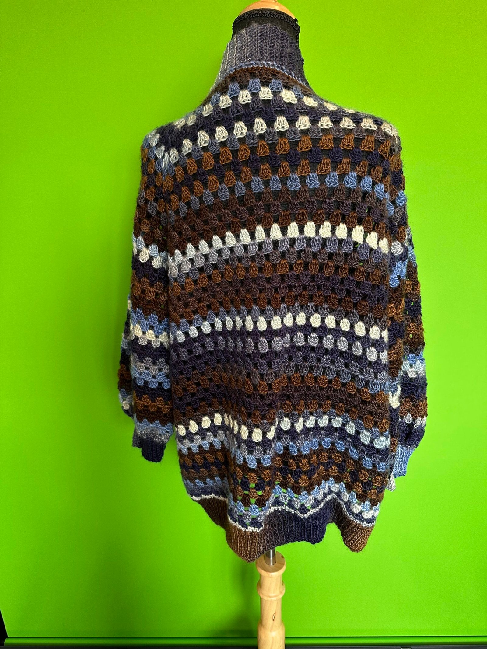 Crocheted Granny Stitch Cardigan. Made with Acrylic Yarn. Care: Washer and Dryer safe.