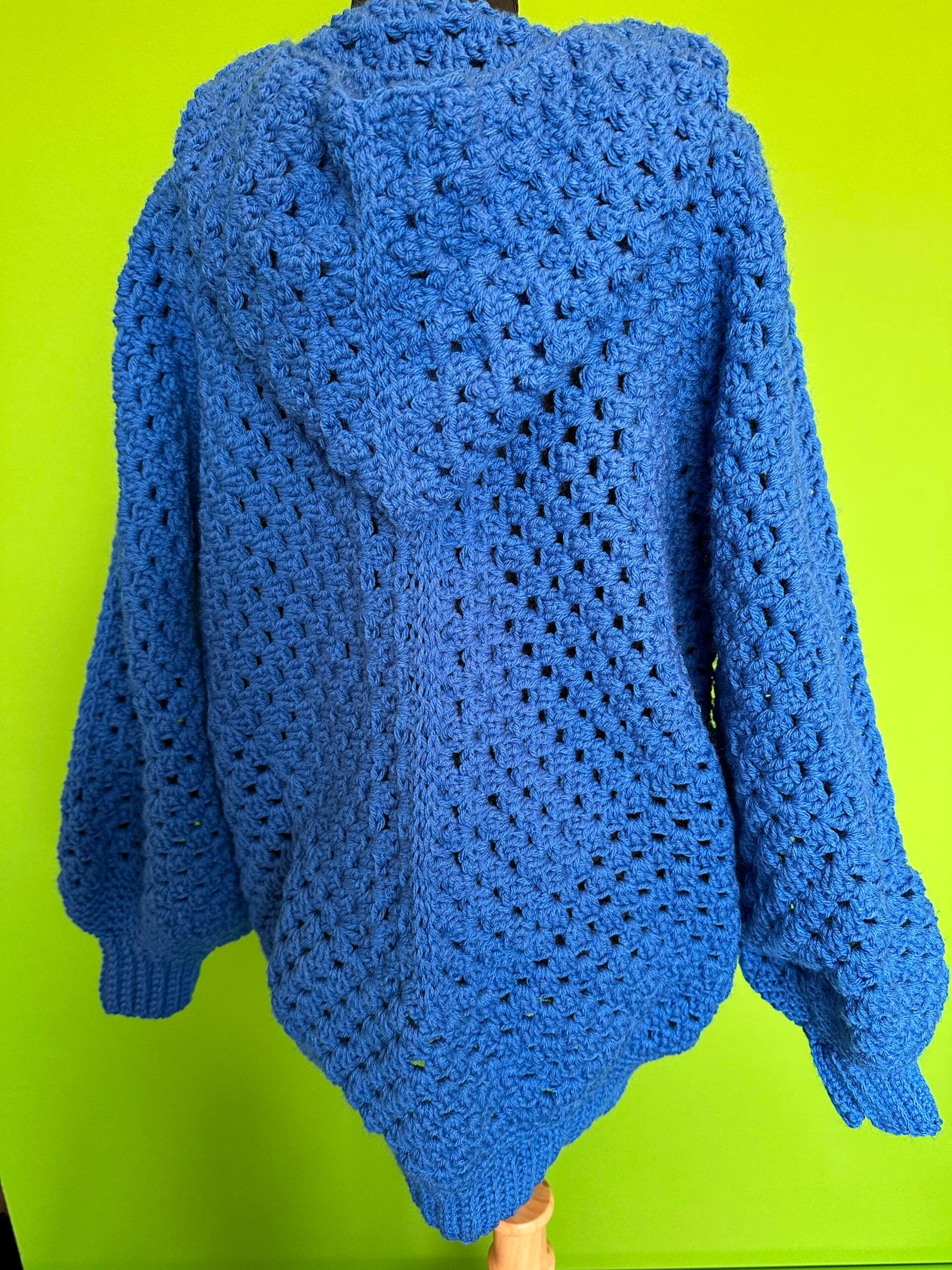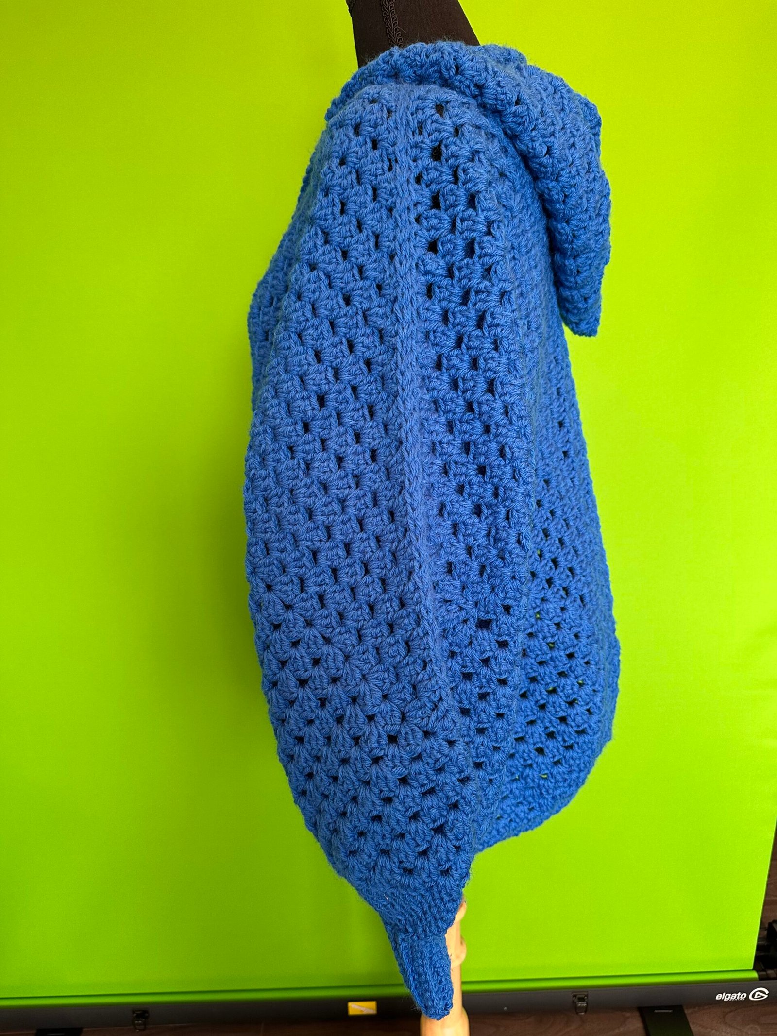 Crocheted Pullover Hoodie, made with acrylic yarn, washer and dryer safe in warm temperatures.